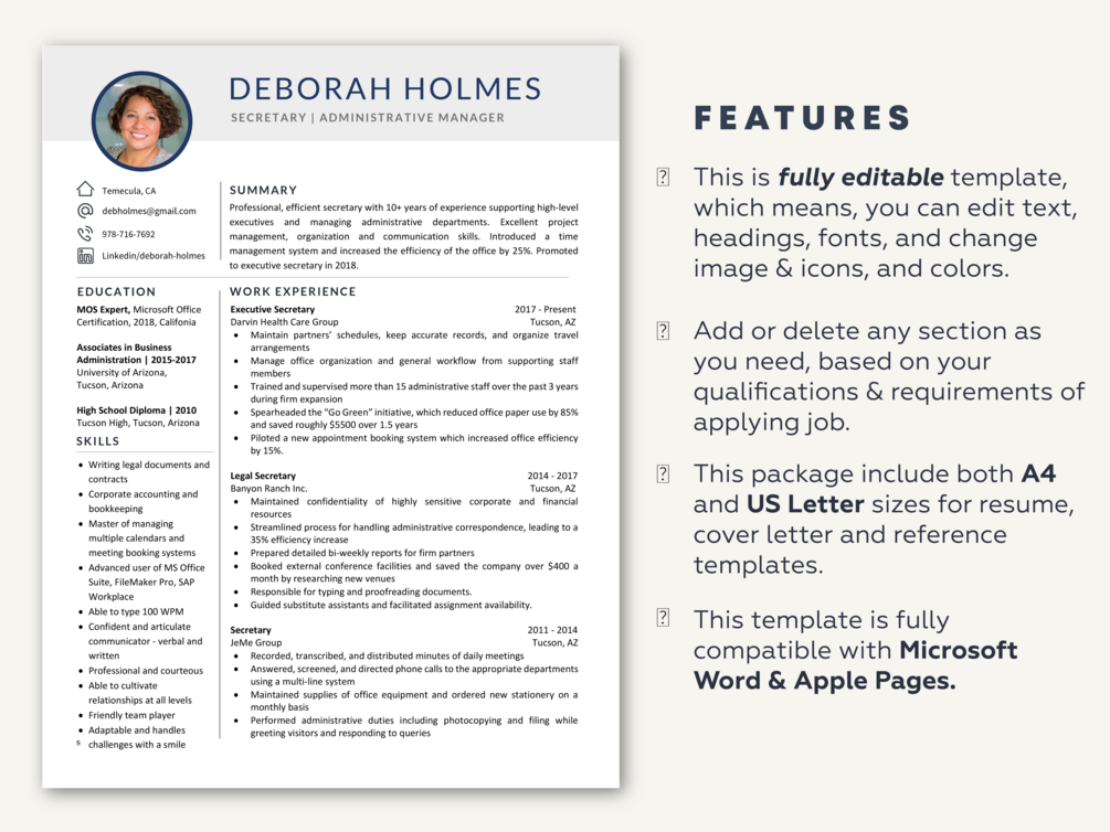This fully editable resume template will help you to create a perfect resume to land on your dream job. You can change icons, fonts, colors, add or delete sections. We provide both Word and Apple Pages versions, so that you are covered on any system. Also the template package comes with both A4 and US Letter sizes. After editing as you want, you can save it as a PDF and send. You can use as many templates as you want. It stays with you forever!.